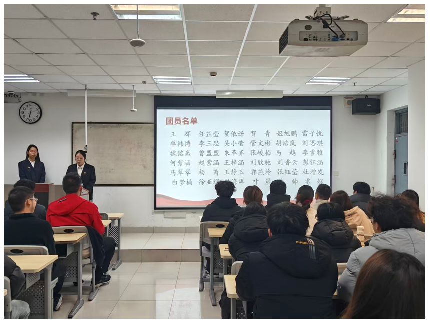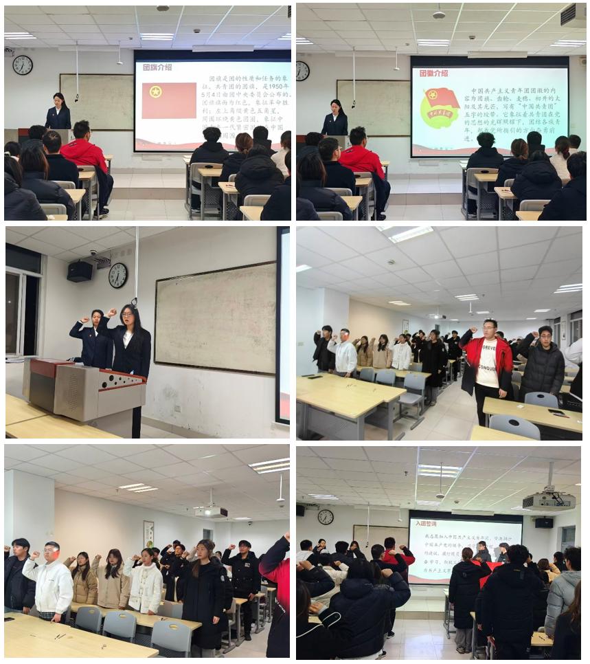 团员代表向新团员阐释了团旗与团徽的深刻内涵:团旗的鲜红底色象征革命胜利,左上角的黄色五角星及环绕的圆圈,寓意着中国青年紧密团结在中国共产党周围;团徽则承载着共青团团结带领广大青年为党和国家事业不懈奋斗的初心与使命。随后,在领誓人何紫涵的带领下,全体新团员面向团旗,高举右拳,庄严宣誓。誓言铿锵,目光坚定,充分彰显了新一代团员坚定的理想信念与责任担当。