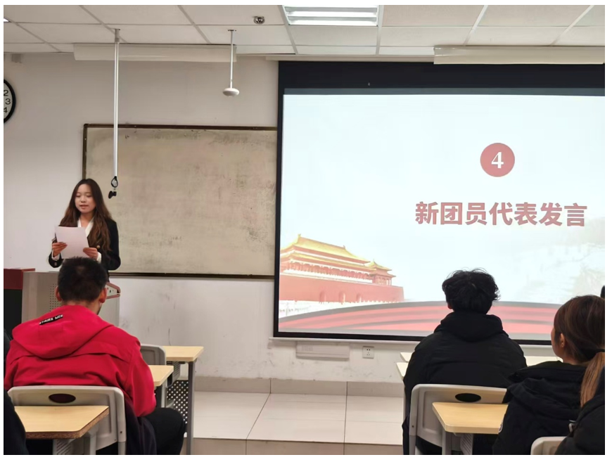 优秀团员代表李彦兴随后发言,她向新团员表示祝贺,并结合自身成长经历,勉励大家牢记誓言、坚定信念、勤学修德、勇于担当,将个人理想追求融入国家发展大局,以实干践行“请党放心,强国有我”的青春誓言。