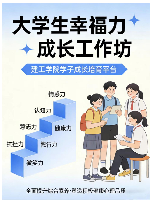 为全面提升学生综合素养,助力青年学子塑造积极健康的心理品质,近日,建工学院正式成立“大学生幸福力成长工作坊”。工作坊以“幸福力”为核心,聚焦情感力、认知力、意志力、健康力、抗挫力、德行力、微笑力七大维度,构建全方位、多层次的成长培育体系,为学院学子搭建起提升自我、滋养心灵的优质平台。
